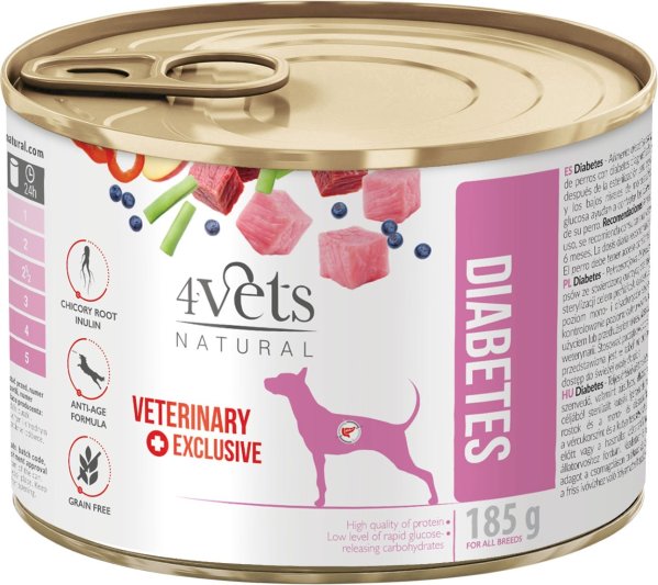 4Vets Dog Diabetes to pełnoporcjowa dietetyczna karma weterynaryjna, opracowana specjalnie dla psów ze stwierdzoną cukrzycą oraz dla psów z nadwagą, otyłych lub po zabiegu sterylizacji. Karma jest wzbogacona w błonnik oraz ma niski poziom węglowodanów szybko uwalniających glukozę, co pomaga utrzymać odpowiedni poziom cukru we krwi i sprzyja utracie wagi. Dzięki zmniejszeniu wahań poziomu glukozy, karma zapobiega powikłaniom cukrzycy oraz wspiera profilaktykę otyłości.
