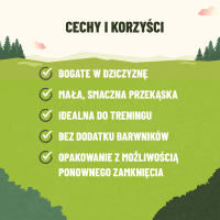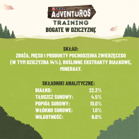 Adventuros Training Bogate w Dziczyznę to smakowite, lekkie przekąski idealne jako nagroda podczas spacerów lub treningu. Ich niewielki rozmiar oraz chrupiąca struktura sprawiają, że doskonale nadają się do szkolenia i motywowania psów każdej wielkości. Produkt nie zawiera barwników i charakteryzuje się niską zawartością tłuszczu, dzięki czemu stanowi zdrowy dodatek do codziennej diety pupila.