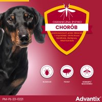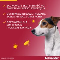 Bayer Advantix to preparat ochronny w kroplach dla psów powyżej 7 tygodnia życia i ras od 4 do 10kg, eliminujący kleszcze, pchły, wszy, wszoły.