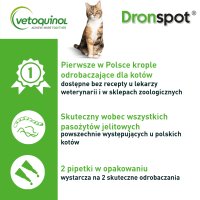 Dronspot to pierwszy na rynku produkt OTC do zwalczania inwazji nicieni i tasiemców z przewodu pokarmowego kota, w formie kropel do podania na skórę. Wygodna i bezpieczna forma aplikacji idealnie sprawdzi się u kotów, które nie dają sobie podać tabletki.