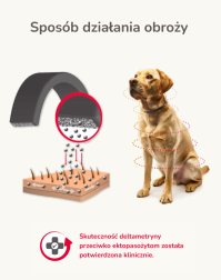 Obroża dla małych i średnich psów z deltametryną, o klinicznie potwierdzonej skuteczności przeciw ektopasożytom. Stopniowo uwalniana deltametryna przemieszcza się z matrycy polimerowej obroży do warstwy lipidowej skóry i rozprzestrzenia się za jej pośrednictwem po całym ciele psa.