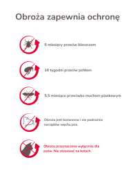 Obroża zapewnia skuteczną ochronę przeciw pchłom do 4 miesięcy, przeciw kleszczom do 6 miesięcy, przeciw muchom piaskowym do 5,5 miesiąca. Obroża osiągnie pełną skuteczność osiąga w 7 dniu od aplikacji.