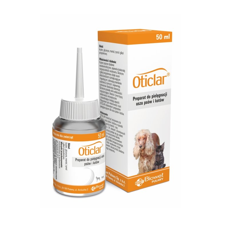 OTICLAR może być stosowany do toalety uszu psów i kotów w sposób regularny raz do dwóch razy tygodniowo. W stanach chorobowych uszu, zazwyczaj podaje się go celem wstępnego oczyszczenia kanału słuchowego, przed zastosowaniem właściwego środka terapeuty- czynnego. Zbyt duża ilość woskowiny może obniżać bowiem skuteczność działania zasadniczego preparatu.