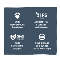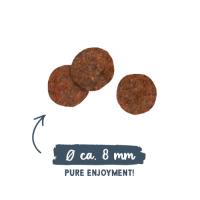 Formuła została wzbogacona o naturalne składniki wspomagające układ pokarmowy – cykoria i ekstrakt z jukki schidigera pomagają utrzymać prawidłową florę jelitową i ograniczają nieprzyjemny zapach odchodów. Siemię lniane i olej z łososia dostarczają niezbędnych kwasów tłuszczowych omega, które wspierają zdrową skórę i lśniącą sierść. Dodatek zielonych małży wspomaga kondycję stawów, a nagietek i borówki działają antyoksydacyjnie, chroniąc komórki przed stresem oksydacyjnym.
