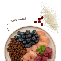 Główne składniki: jagnięcina, drób, ryż, siemię lniane, olej rybny, borówki, zielone małże