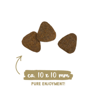 świeże mięso drobiowe, mąka pszenna, tłuszcz zwierzęcy, kukurydza, wątróbka (odwodniona), mączka z ryb (min. 5% mączki z łososia), skwarki (odwodnione), pszenica, mięso hydrolizowane, sproszkowana pszenica, świeża mączka mięsna, sproszkowane jaja (odwodnione), wysłodki buraczane, siemię lniane, wysłodki buraczane, drożdże (odwodnione), olej rybny, chlorek sodu.