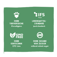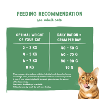 Dodatek oleju z łososia i siemienia lnianego dba o zdrową skórę i piękną, lśniącą sierść, natomiast Jukka Schidigera ogranicza nieprzyjemny zapach i objętość odchodów. W składzie znajdziemy również żurawinę i borówkę, które wspierają układ moczowy, oraz nagietek, znany ze swoich właściwości antyoksydacyjnych.