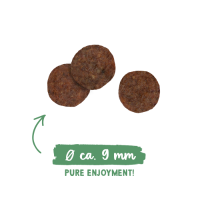 Karma dostarcza dobrze przyswajalnego białka zwierzęcego, które wspiera prawidłową pracę mięśni i układu odpornościowego. Dzięki zawartości ryżu i mąki ryżowej produkt jest łagodny dla żołądka i jelit, a cykoria i prebiotyki (MOS i β-glukany) pomagają utrzymać zdrową mikroflorę jelitową i wspierają naturalną odporność.