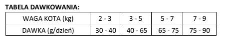 | Waga kota (kg) | Dzienna porcja (g/dzień) |