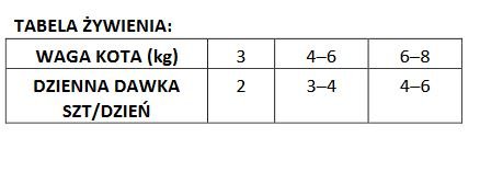 Zalecana dawka dobowa została podana w tabeli żywienia, ale może się różnić w zależności od wieku kota, jego aktywności oraz środowiska w którym żyje.
