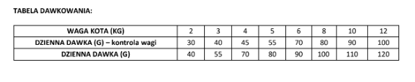| Dzienna dawka (g) - kontrola wagi | 30 | 40 | 45 | 55 | 70 | 80 | 90 | 100 |