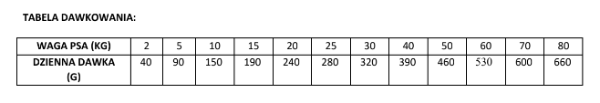 | Waga psa (kg) | 2 | 5 | 10 | 15 | 20 | 25 | 30 | 40 | 50 | 60 | 70 | 80 |