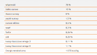 witamina A (3a672a) 800 IU, witamina D₃ (3a671) 200 IU, witamina E (3a700) 120 mg, witamina B₁ (3a821) 1 mg, tauryna (3a370) 800 mg, biotyna (3a880) 0,4 mg, cynk (3b606) 10 mg, mangan (3b504) 2,4 mg, jod (3b201) 0,6 mg, miedź (3b406) 3,2 mg, żelazo (3b106) 8 mg.