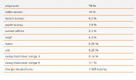 białko surowe 10,8%, tłuszcz surowy 7,6%, popiół surowy 2,6%, włókno surowe 0,4%, wilgotność 78,5%.