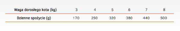 witamina A 800 j.m., witamina D3 200 j.m., witamina E 120 mg, witamina B1 1 mg, tauryna 800 mg, biotyna 0,4 mg, cynk 10 mg, mangan 2,4 mg, jod 0,6 mg, miedź 3,2 mg, żelazo 8 mg, L-metionina 5000 mg.