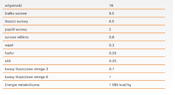 kaczka 70%, ryż 4%, mąka grochowa, lignoceluloza, olej z łososia 1%, węglan wapnia