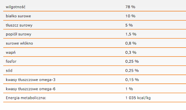 królik (70%), mąka grochowa, lignoceluloza, olej z łososia (1%), węglan wapnia, suszone algi (0,2%, Schizochytrium limacinum).