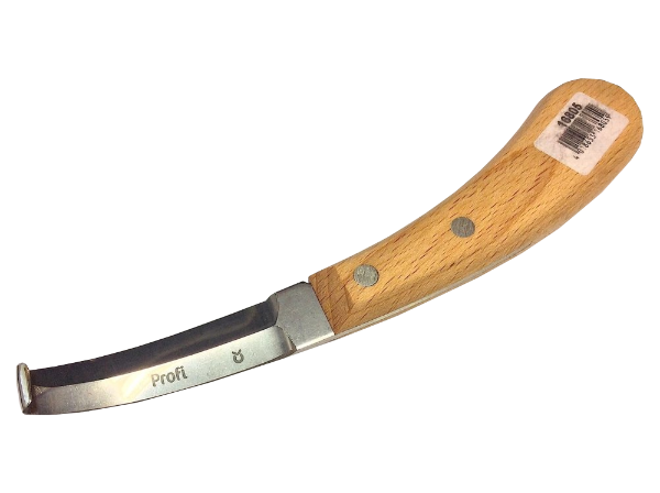 Nóż obustronny do korekcji kopyt i racic, z drewnianą rączka.