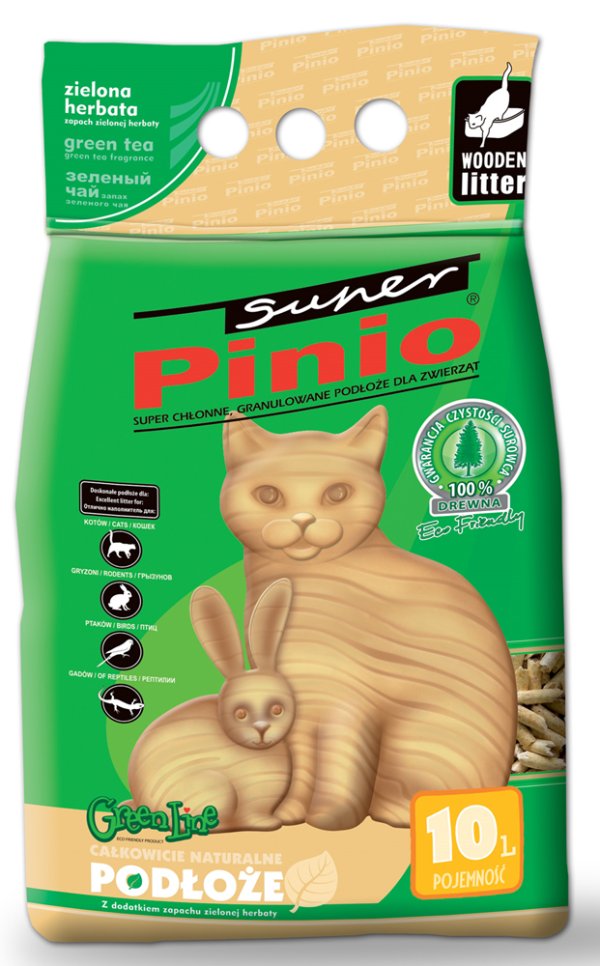 Żwirek z dodatkiem ekstraktu z zielonej herbaty. Pozostawia w otoczeniu toalety przyjemny, świeży zapach, który działa odprężająco na kota. Żwirek Super Pinio Pellet to niezbrylające podłoże dla zwierząt domowych wykonane w 100% z naturalnego drewna drzew iglastych – mikrowłókien drzew sosnowych i świerkowych, bez dodatków chemicznych. Posiadają bardzo wysoką wchłanialność oraz doskonale wiążą zapachy. Produkty występują w postaci granulatu o kształcie wałeczków o średnicy 6 mm. Są przyjazne dla środowiska i zwierząt, a także w 100% biologicznie odbudowywalne.