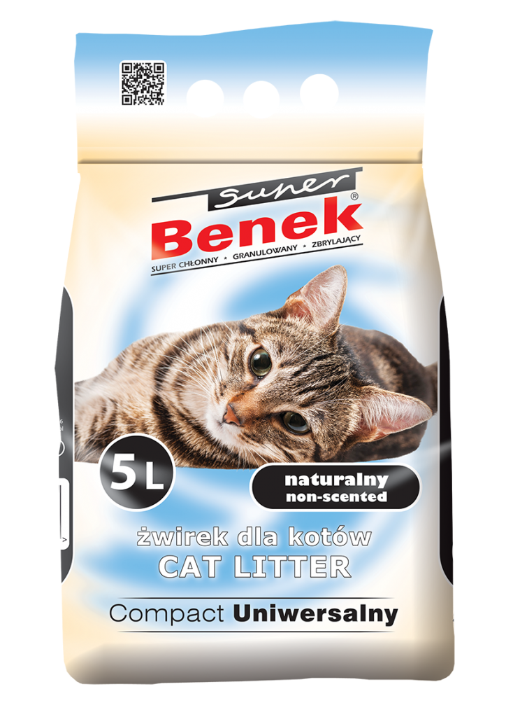 Kocią toaletę napełnić żwirkiem "Super Benek Uniwersalny Compact".