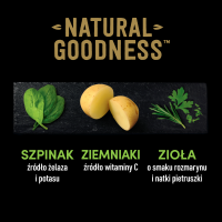 Mokra karma Cesar Natural Goodness to pełnoporcjowe jedzenie dla dorosłych psów, wyprodukowana z użyciem naturalnych składników. Zostało przygotowane według starannie dobranej receptury, w której opracowaniu brali udział dietetycy i lekarze weterynarii z Instytutu Nauki o Zwierzętach WALTHAM. To jedzenie dla psa można podawać w połączeniu z karmą suchą lub jako samodzielne, wyśmienite danie. Cesar Natural Goodness Bogaty zawiera nie tylko mięso i produkty pochodzenia zwierzęcego, ale także pyszne warzywa i zioła. Karma o smaku jagnięciny przybranej marchewką, ziemniakami i szpinakiem.