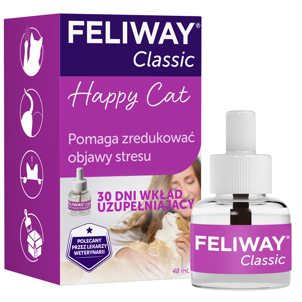Płyn do dyfuzora Feliway Classic. Dyfuzor Feliway Classic to doskonałe rozwiązanie do uspokajania kotów domowych i wyeliminowania oznak stresu: znaczenia moczem, drapania i chowania się.