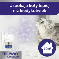 Feliway® Optimum dyfuzor antystresowy to innowacyjny produkt stworzony, by zmniejszyć stres u kotów w różnych sytuacjach, takich jak zmiany w otoczeniu, przeprowadzki czy konflikty między kotami. Zawiera unikalną kompozycję feromonów, które pomagają kotom poczuć się bezpieczniej i bardziej komfortowo. Jest to skuteczne narzędzie w walce ze stresem, ponieważ wspiera naturalne sygnały dobrej kondycji i dobrostanu wysyłane przez koty. Dyfuzor działa na koty, ale jest całkowicie bezwonny dla ludzi i innych zwierząt w domu.