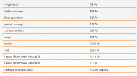 białko surowe 10,9%, tłuszcz surowy 7,4%, popiół surowy 2,6%, włókno surowe 0,4%, wilgotność 78,5%.