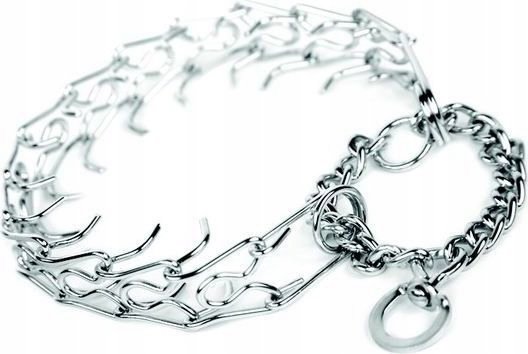 Kolczatka wykonana z wysokiej jakości drutu pokrytego chromem, co zapewnia jej odporność na rdzewienie i długotrwałe użytkowanie. Jest to kolczatka zaciskowa, którą zakłada się przez głowę psa. Kolce w kolczatce są zaokrąglone, co minimalizuje ryzyko podrażnień w porównaniu do tradycyjnych kolczatek, zapewniając jedynie dyskomfort w przypadku nadmiernego ciągnięcia psa na smyczy.