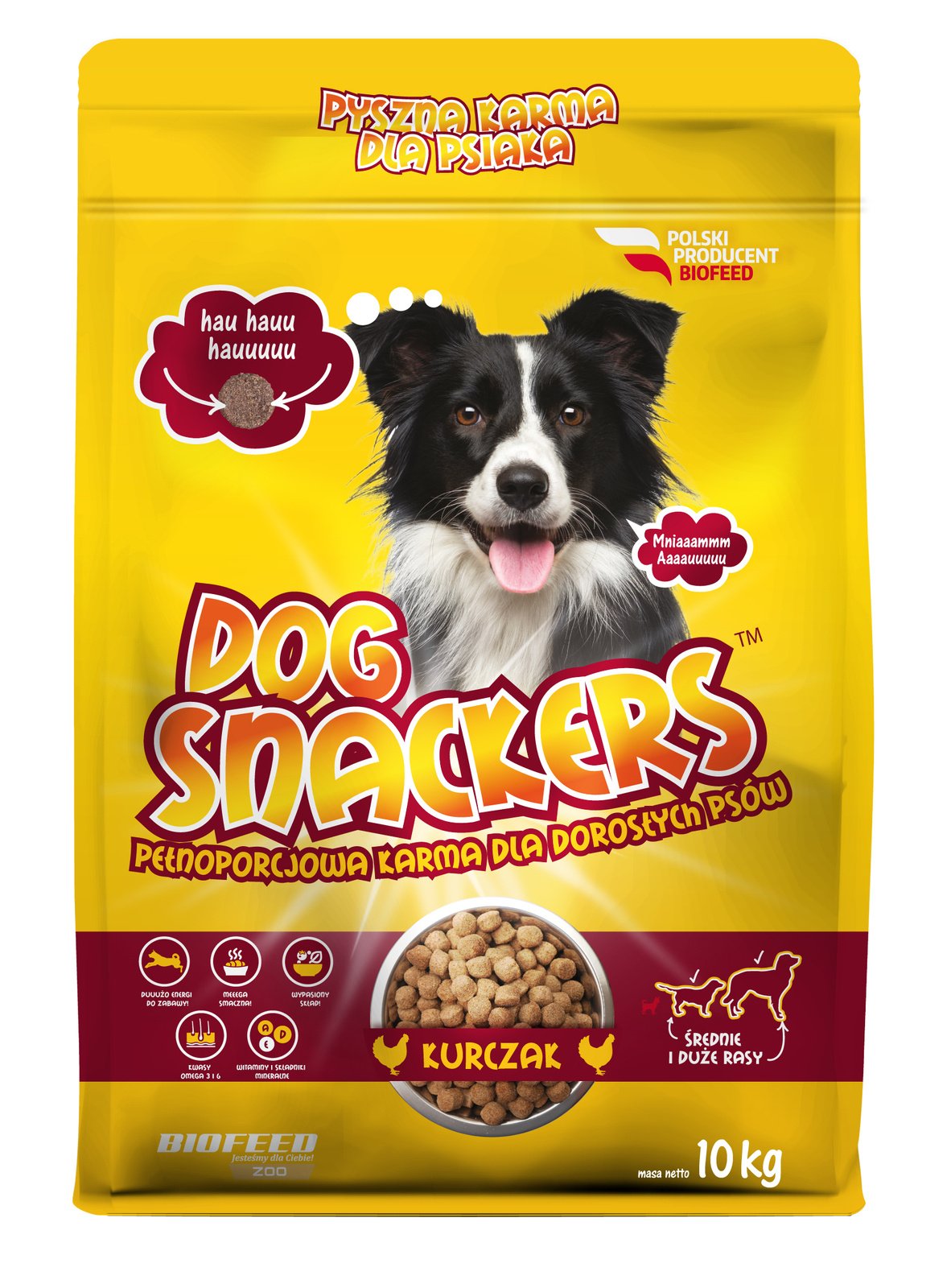 Dog Snackers z kurczakiem to pełnoporcjowa, zbilansowana karma sucha dla dorosłych psów średnich i dużych ras. Zawiera wysoką ilość mięsa i składników pochodzenia zwierzęcego, co zapewnia doskonałą smakowitość i przyswajalność.