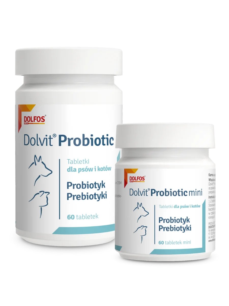 Tabletki dla psów i kotów. Dolvit Probiotic zawiera probiotyki i prebiotyki wspomagające prawidłowe funkcjonowanie przewodu pokarmowego.