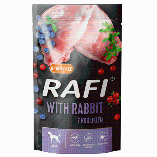 Pełnoporcjowa mokra karma z królikiem dla dorosłych psów wszystkich ras. Karma Rafi z królikiem to produkt stworzony w oparciu o nowoczesne normy i zalecenia prawidłowego żywienia. Jej skład w pełni pokrywa zapotrzebowanie na niezbędne składniki odżywcze, mineralne i witaminy. Mięso i surowce pochodzące z królika, oprócz pełnowartościowego białka, są źródłem żelaza, selenu i cynku biorących udział w pobudzaniu funkcji obronnych organizmu. Karma nie zawiera dodatków substancji konserwujących ani barwników poprawiających smak i stymulujących apetyt. To obecność w składzie borówki, żurawiny i tymianku naturalnie podnosi atrakcyjność sensoryczną posiłku dla psa.