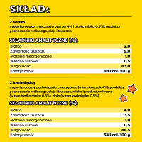 Skład (ser): mleko i produkty mleczne (w tym ser 4%, białko mleka 0,5%), produkty roślinne, oleje i tłuszcze