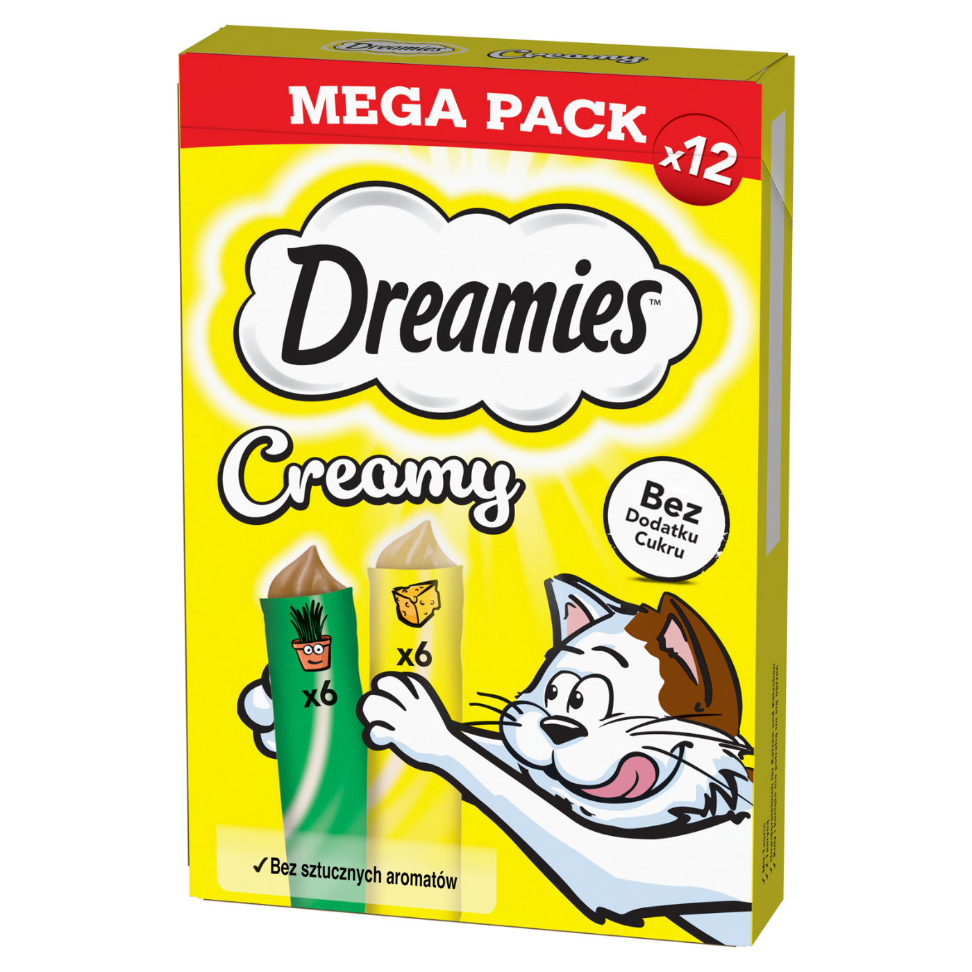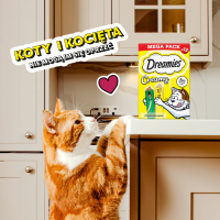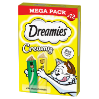 DREAMIES™ Creamy MEGA PACK to zestaw kremowych przysmaków w dwóch smakach – aromatycznego sera i kocimiętki – opracowany z myślą o dorosłych kotach oraz kociętach powyżej 8. tygodnia życia. Aksamitna konsystencja sprawia, że smakołyki można podawać prosto z ręki, w miseczce lub jako pyszny dodatek do karmy.