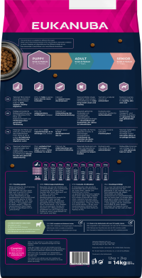 Sucha karma Eukanuba zawiera także L-karnitynę. Związek ten wspomaga redukcję tkanki tłuszczowej w organizmie. Twoje szczenię może utrzymać optymalną wagę, a jego stawy są mniej obciążone. Unikatowe sześcienne granulki karmy Eukanuba i system pielęgnacji zębów DentaDefense zapewnią czyste, zdrowe zęby przez długi czas. Granulki Eukanuba wspierają również zdrową skórę i lśniącą okrywę włosową z pomocą naturalnych źródeł kwasów tłuszczowych omega 6 i omega 3. Pomagają one także zmniejszyć linienie u szczeniąt. Sucha karma Eukanuba, wzbogacona kurkumą, naturalnym źródłem antyoksydantów, wzmacnia również układ odpornościowy. Ta karma jest w 100% kompletna i zbilansowana. Dzięki dużej zawartości jagnięciny i ryżu karma Eukanuba jest idealna dla rosnących szczeniąt małych i średnich ras, jak jamniki, collie, mopsy i spaniele.