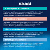 Pełnoporcjowa karma z różnymi rodzajami ryb w galaretce przeznaczona dla dorosłych kotów.