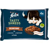 Felix Tasty Shreds to zestaw wyśmienitych posiłków dla wszystkich dorosłych kotów. Ich receptura łączy najwyżej jakości składniki dla zapewnienia Twojemu pupilowi zdrowej i wartościowej diety.