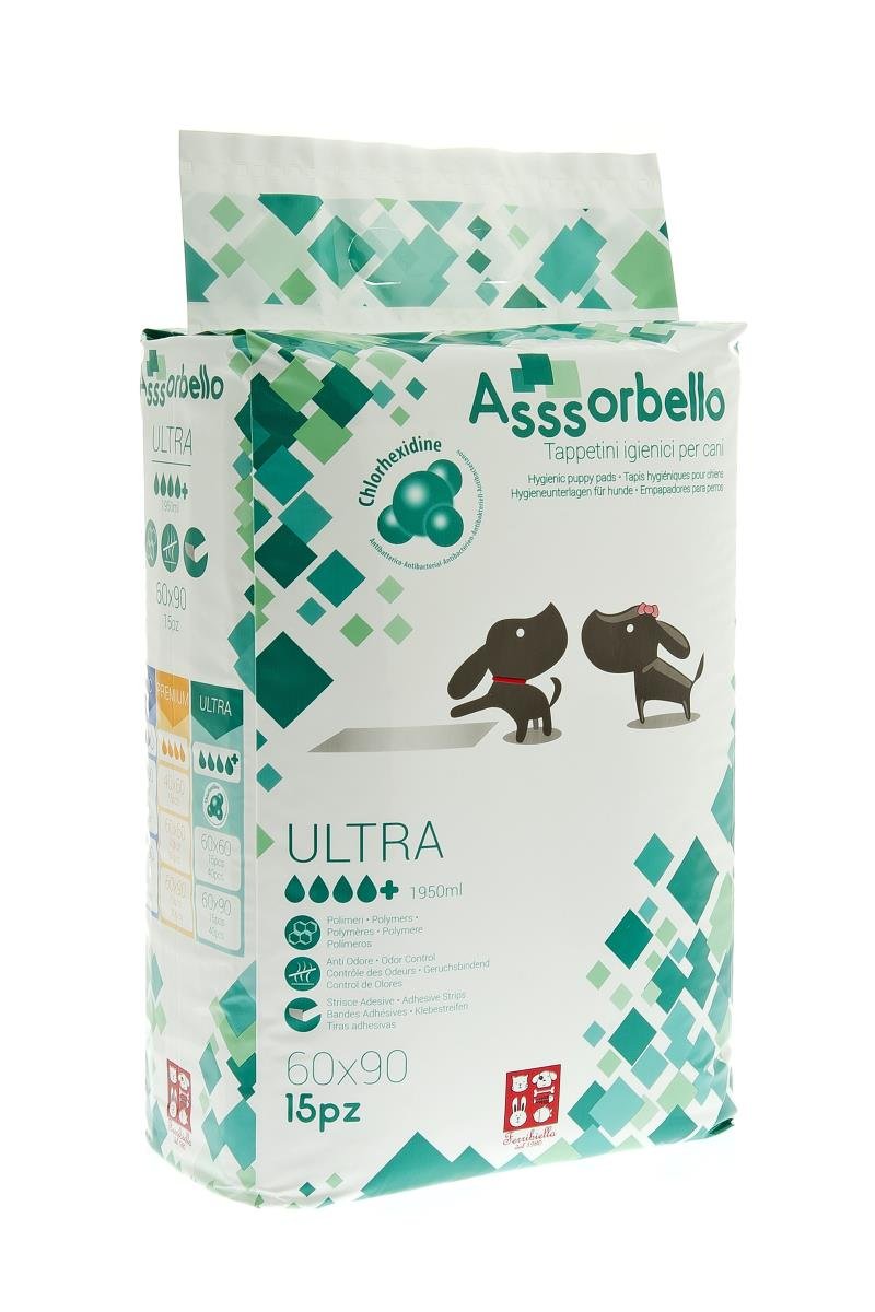 Ferribiella Assorbello Ultra to chłonne podkłady higieniczne o wymiarach 60x90cm, zaprojektowane z myślą o psach, które potrzebują pomocy w utrzymaniu czystości. Doskonałe dla szczeniąt w trakcie nauki czystości, starszych psów oraz psów w czasie choroby. Dzięki swojej wyjątkowej chłonności, podkłady zapewniają suchą i higieniczną przestrzeń, jednocześnie chroniąc podłogę przed zabrudzeniami. Sprawdzają się także podczas długich podróży, zapewniając komfort i higienę. Opakowanie zawiera 15 sztuk podkładów.