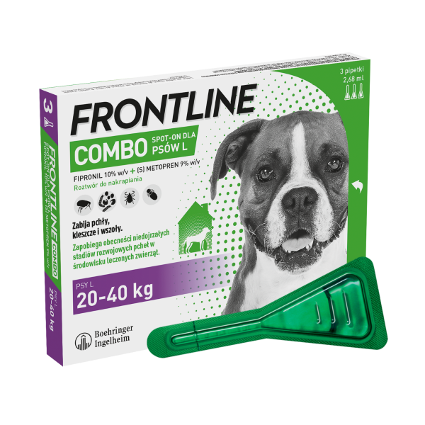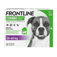 FRONTLINE COMBO dla psów powyżej 8 tygodnia życia, o masie ciała 20-40 kilogramów, to szybkodziałający, długotrwały i wodoodporny produkt leczniczy do zwalczania pcheł i kleszczy. Jedna łatwa aplikacja zapewnia miesięczną ochronę.