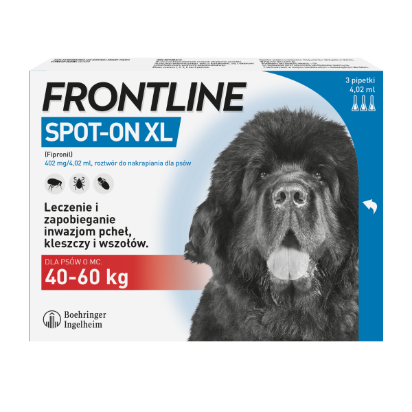 FRONTLINE SPOT-ON dla psów powyżej 8 tygodni, o masie ciała 40-60 kilogramów, to nasze oryginalne rozwiązanie przeciw pasożytom zewnętrznym w postaci łatwego w użyciu roztworu do nakrapiania. Po zastosowaniu chroni Twojego psa przed pchłami i kleszczami przez okres do miesiąca oraz eliminuje wszy.