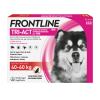 FRONTLINE Tri-Act dla psów od 8 tygodnia życia o wadze 40-60 kg. Zapewnia ultraszybką ochronę, w wyjątkowej formule 3 w 1, zabija pchły i kleszcze i chroni przed ponowną inwazją przez okres pełnego miesiąca. Wodoodporny - działa nawet wtedy, gdy zwierzę zamoknie.