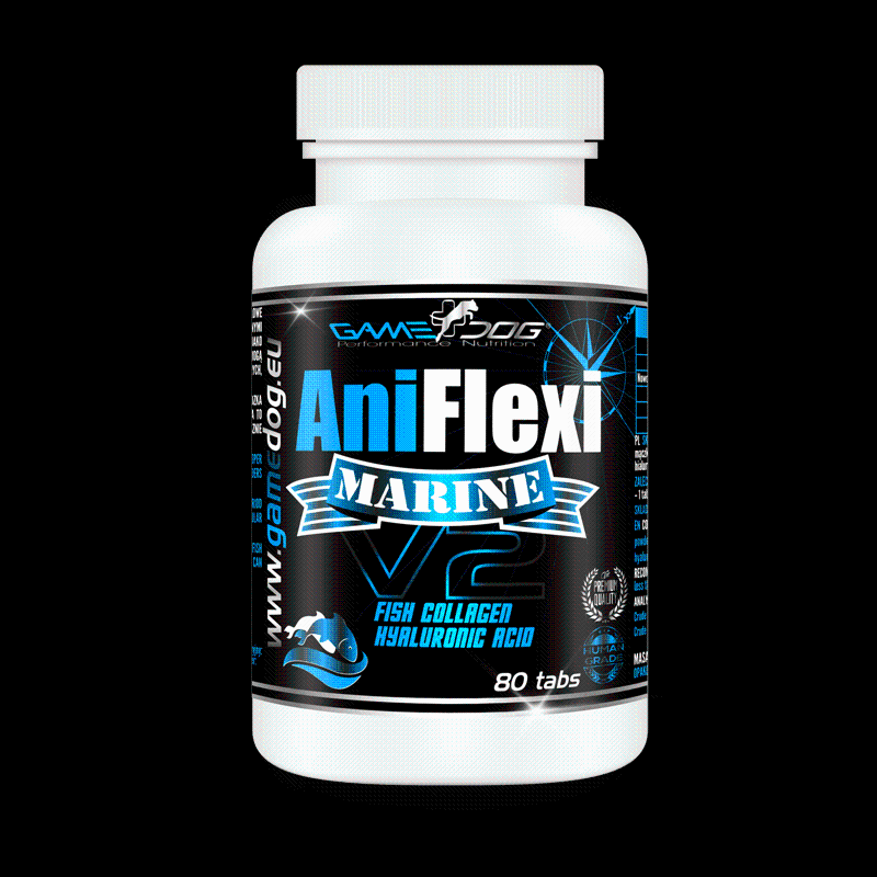 Game Dog AniFlexi Marine V2 80 tabletek to zaawansowany suplement diety wspierający prawidłowe funkcjonowanie układu ruchu u psów. Preparat działa przeciwzapalnie i przeciwbólowo, poprawia elastyczność oraz ruchomość stawów, a także wspomaga regenerację tkanki chrzęstnej i kostnej. Regularne stosowanie spowalnia postęp chorób zwyrodnieniowych, odżywia stawy i redukuje dolegliwości bólowe. Produkt polecany jest psom z problemami stawowymi, w okresie rekonwalescencji, a także młodym zwierzętom w fazie intensywnego wzrostu.