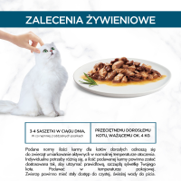Zalecenia żywieniowe: Przeciętnemu dorosłemu kotu, ważącemu ok. 4 kg, zaleca się podawanie 3 do 4 saszetek dziennie, w co najmniej 2-3 oddzielnych posiłkach. Ilość karmy powinna zostać dostosowana do indywidualnych potrzeb kota, aby utrzymać prawidłową sylwetkę. Karma powinna być podawana w temperaturze pokojowej, a zwierzę powinno mieć stały dostęp do świeżej wody.