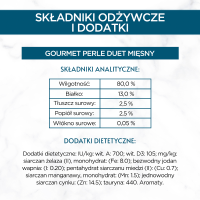 GOURMET™ Perle DUET to elegancka pokusa dla wyjątkowych doznań smakowych każdego dnia. GOURMET™ DUET przygotowano ze składników wysokiej jakości, bez dodatku barwników, sztucznych aromatów oraz sztucznych konserwantów. Każdy kęs to prawdziwa uczta, stworzona z mini filecików w sosie, które zadowolą nawet najbardziej wymagające podniebienia.