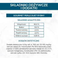GOURMET™ Perle DUET to elegancka pokusa dla wyjątkowych doznań smakowych każdego dnia. Przepisy GOURMET™ DUET są przygotowane z wysokiej jakości składników, bez dodatku barwników, sztucznych aromatów oraz sztucznych konserwantów. Każdy kęs to prawdziwa uczta, stworzona z mini filecików w sosie, które zadowolą nawet najbardziej wymagające podniebienia.