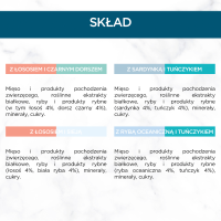 Z sardynką i tuńczykiem: mięso i produkty pochodzenia zwierzęcego, roślinne ekstrakty białkowe, ryby i produkty rybne (sardynka 4 %, tuńczyk 4 %), minerały, cukry