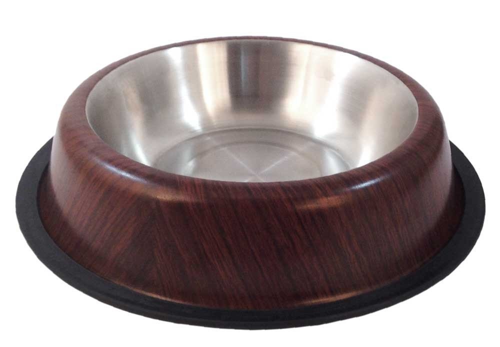 Metalowa miska z błyszczącym środkiem, imitacją drewna na zewnątrz oraz matowym wykończeniu.