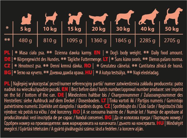 Podawaj 1-2 posiłki dziennie, dostosowując ilość do wieku, kondycji i aktywności psa. Pies powinien mieć zawsze dostęp do świeżej wody pitnej.