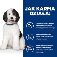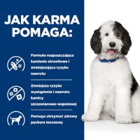 Karma dla psów Hill's PRESCRIPTION DIET c/d Multicare z kurczakiem to pełnoporcjowa karma dietetyczna wspomagająca redukcję nawrotów kamieni struwitowych, rozpuszczanie kamieni struwitowych oraz redukcję powstawania kamieni ze szczawianu wapnia u dorosłych psów. Ta karma ma własności zmniejszające nasycenie moczu struwitem, własności alkalizujące mocz oraz ma niską zawartość magnezu, wapnia i witaminy D.
