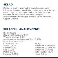 Karma została wzbogacona za to w witaminy z grupy B. Ich podwyższona wartość jest niezbędna, wyrównują straty witaminowe, które pies traci wraz z moczem. Bogactwo witaminy E i beta karotenu, które zwalczają kamicę moczową. Brak witaminy C przeciwdziała zakwaszaniu moczu, co mogłoby być niebezpieczne w przypadku choroby nerek.